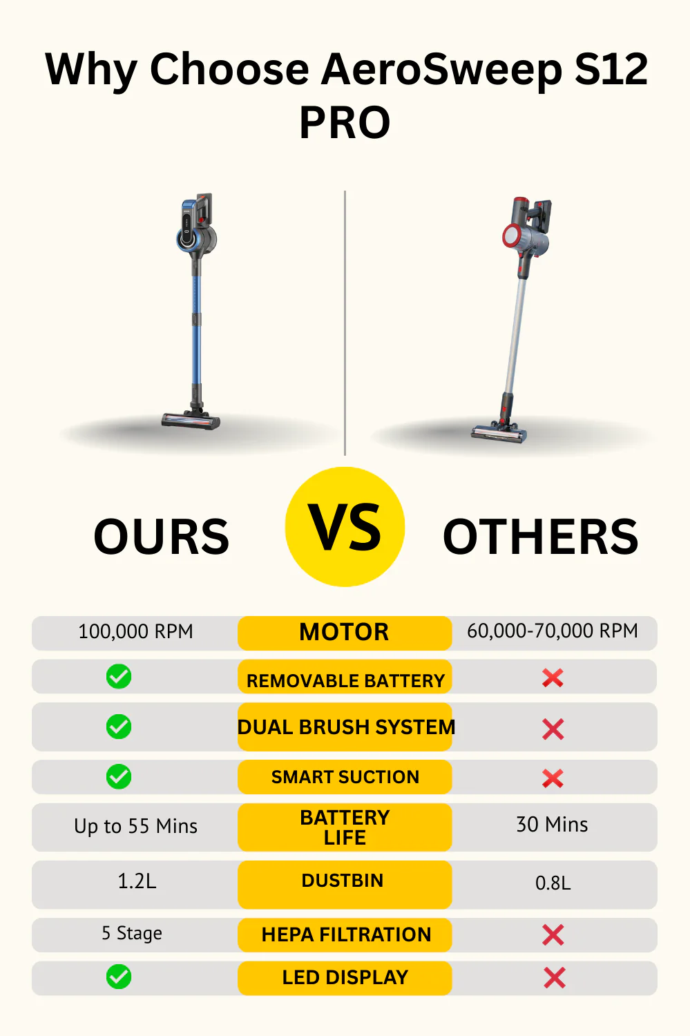 The AeroSweep S12 Pro combines high-speed suction, intelligent performance, and cordless freedom to make everyday cleaning faster and easier. Its powerful 100,000 RPM motor ensures deep cleaning across all surfaces