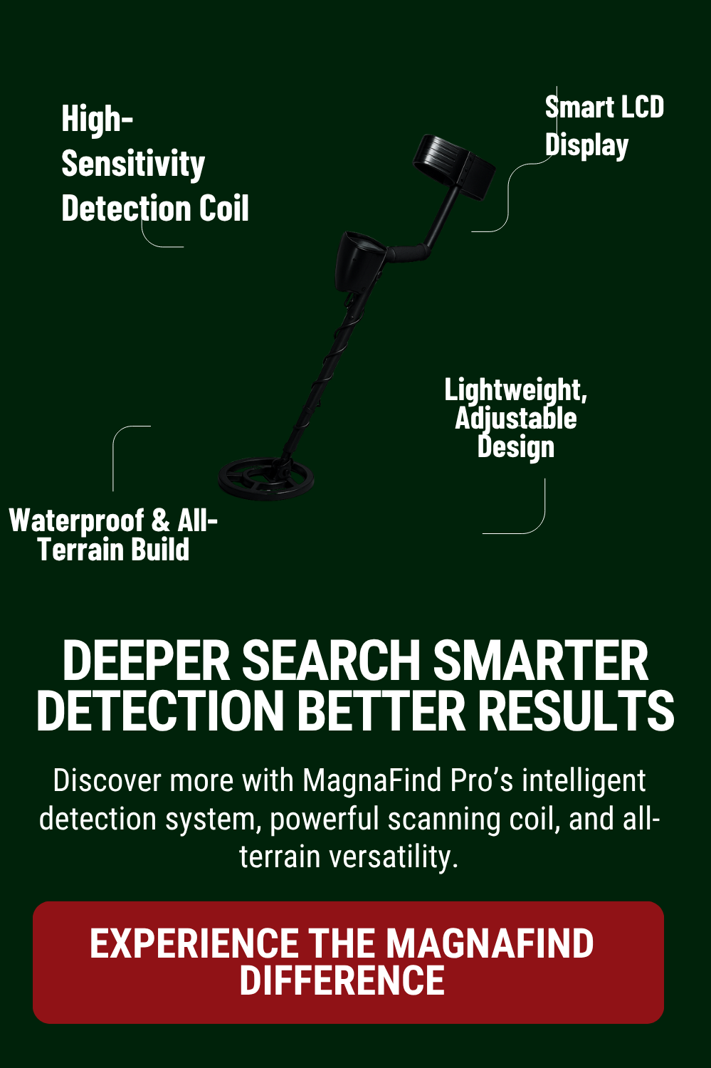 MagnaFind Pro is equipped with an advanced high-sensitivity coil designed to detect a wide range of metals — from coins and jewelry to buried relics — with pinpoint accuracy. Experience consistent, stable results even in challenging ground conditions.